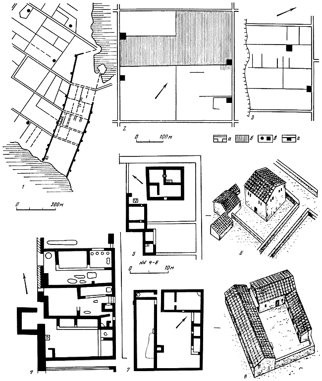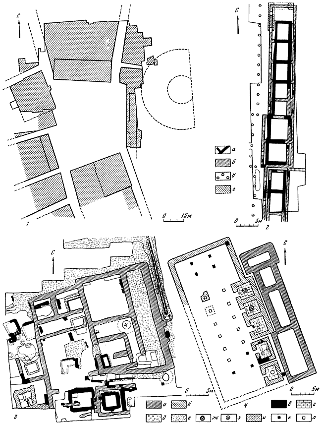 1 — общий вид дома Е2, район агоры (реконструкция С.Д. Крыжицкого); 2 — план жилого квартала в Нижнем городе; 3, 4 — дом с алтарем в Нижнем городе (реконструкции Б.В. Фармаковского и Калачева).