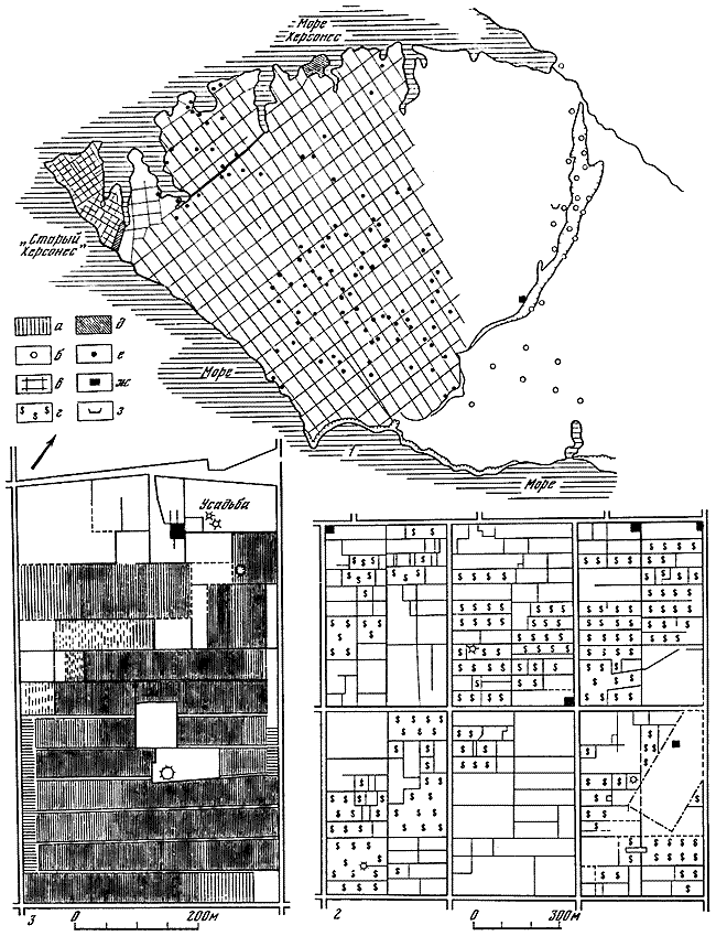 1 — земельные наделы и поселения на Гераклейском и Маячном полуостровах; 2 — группа типичных земельных наделов на Гераклейском полуострове; 3 — земельный надел № 26 с усадьбой.