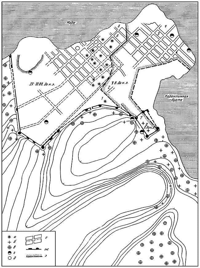 а — некрополь V–IV вв. до н. э.; б — некрополь III II вв. до н. э.; в — некрополь I–IV вв. н. э.; г — гончарные мастерские; д — стеклоделательная печь; е — жилые кварталы; ж — оборонительные стены; з — примерные границы города в V–IV вв. до н. э.