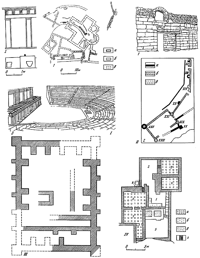 I — античный театр: 1 — план раскопа: а — строительные остатки III–II вв. до н. э.; б — перестройки первых веков нашей эры; в — средневековая застройка театрального участка; 2 — часть основания проскения III–II вв. до н. э. со следами опор; вверху — часть фасада проскения у левого парода (реконструкция О.И. Домбровского); 3 — театр III–II вв. до н. э. (реконструкция Т.Л. Жаворонковой).