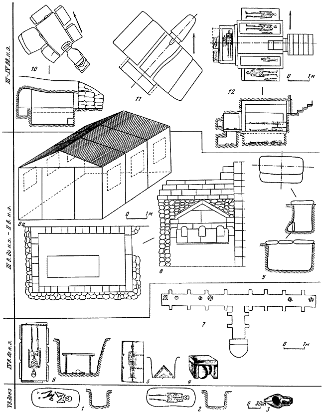 1, 2 — грунтовые могилы; 3 — захоронении в амфоре на Северном берегу; 4 — погребение в урне; 5, 6 — могила с черепицей и каменной обкладкой; 7 — план склепа 1012; 8 — пристенный склеп 1013, план, разрезы, внутренние стены с нишами; 8а — аксонометрия склепа 1014; 9 — план и разрезы подбойной могилы; 10, 11, 12 — склепы позднеримского времени (планы и разрезы).