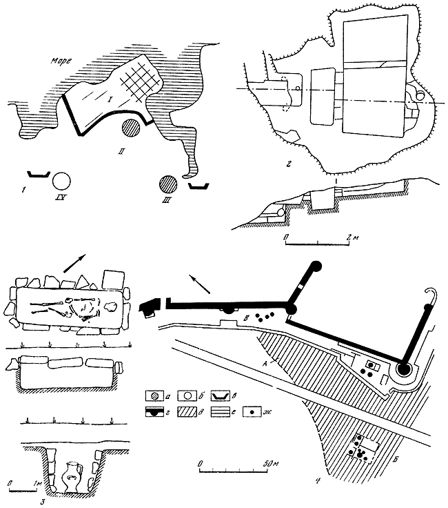 1 — план расположения поселений и некрополей: I — Херсонес; II — поселок гончаров; III — поселок виноделов, IV — поселок каменщиков; 2 — винодельня, вырубленная в скале у верховья Карантинной бухты; 3 — типы погребений в некрополе у Песочной бухты; 4 — район гончарных мастерских: а — поселение; б — предполагаемое поселение; в — некрополь; г — крепостные стены; д — предполагаемый район производственного поселения; е — протейхизма; ж — керамические печи.