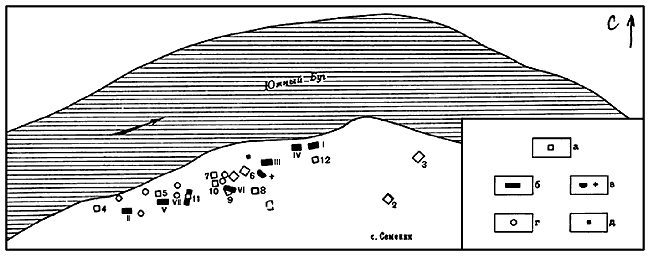 На берегу Южного Буга подобные памятники открыты у сел Губник, Шуровцы, Степашки I, Степашки II Гайсинского района, Ладыжин, Скибинцы (остров Мытковский) Тростянецкого района, Семенки и Самчинцы Брацлавского района. Степашское поселение расположено в 2 км от села Харпачки на краю мыса, выступающего в долину Южного Буга. Находки у с. Губник сосредоточены в урочище Сажавке, в 1 км от села. В этом месте в обрыве берега реки часто встречается лепная керамика, а во время разведки были открыты остатки железоплавильной печи. В 3 км ниже с. Ладыжина, против урочища Швейцарии, на размытых участках широкой правобережной надпоймы Южного Буга собраны многочисленные обломки лепной керамики, а в центре этой площадки найдены остатки большого сосуда с валиком под краем венчика, поверхность которого покрыта насечками. В этом же месте встречается славянская керамика VIII–IX вв. н. э. В подобных сочетаниях встречается раннеславянский материал на поселениях Шуровцы, в урочище Березине, где в обрыве надпоймы левого берега Южного Буга обнаружены три сосуда, два из которых полностью реставрированы. В 1959 г. на острове Мытковском между селами Скибинцы и Мытковка Тростянецкого района раскопано поселение, занимавшее прибрежную, юго-восточную часть острова. На исследованной площади оказались два жилища, два хозяйственных сооружения и несколько ям, заполненных керамикой, костями животных, рыб и рыбьей чешуей. Памятник датируется пластиной с изображением льва мартыновского типа (рис. 2) и бронзовым массивным браслетом с утолщенными концами (см. ниже рис. 14, 9).