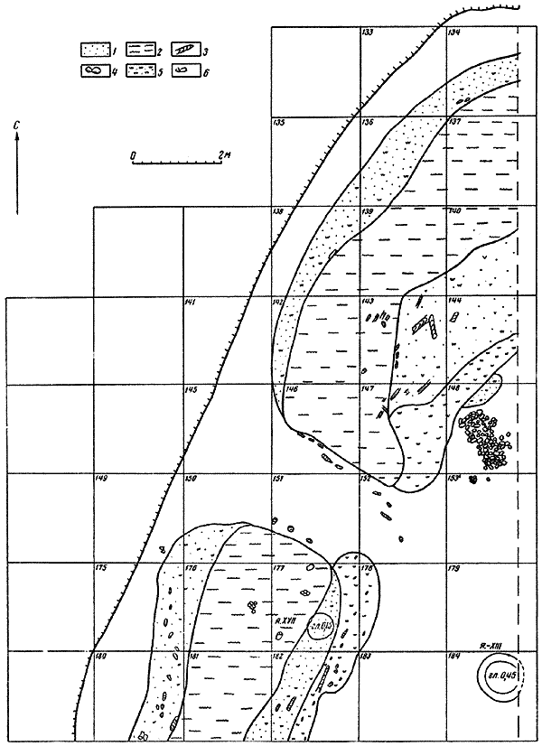 1 — песок; 2 — зола; 3 — обугленное дерево; 4 — камни; 5 — прожженный пестрый песок; 6 — скопления керамики.
