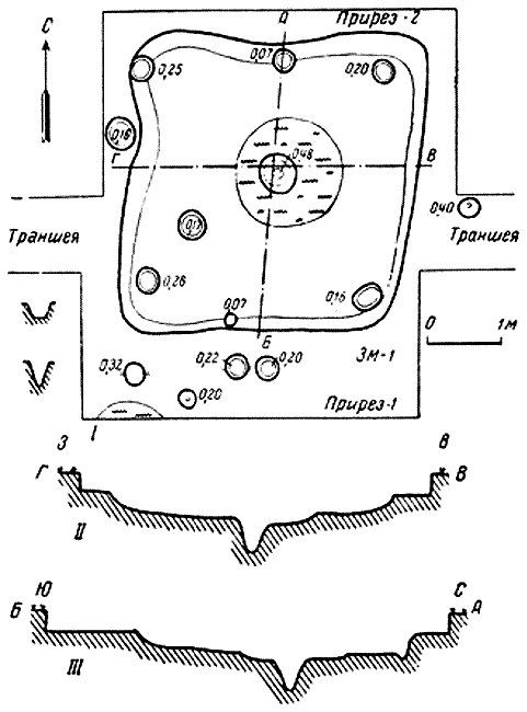 Последние два штыка разреза вала пройдены по материку до коричневатого твердого слежавшегося песка. Разрез вала 1 закончен на глубине 3,50 м. На большой глубине было сделано мало находок. На глубине 2,30 м от вершины вала было найдено 10 мелких обломков лепной керамики, среди которых имелся венчик сосуда зарубинецкого типа, украшенный по краю насечками. Последние черепки, к сожалению, совершенно невыразительные, встречаются на глубине 2,90 м.