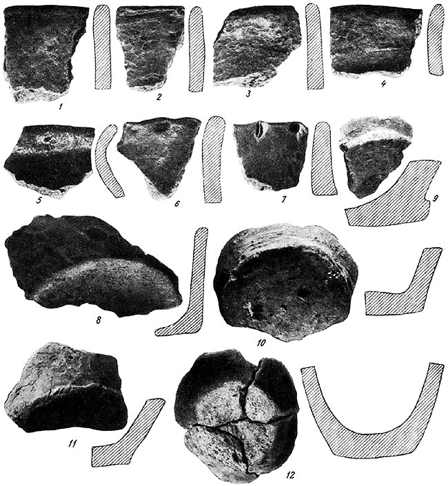 Окончательный и последний разгром городища произошел где-то в конце VII–VIII в. н. э. По-видимому, победителям принадлежал засевший в земле на площадке городища железный наконечник дротика-сулицы или арбалетной стрелы с плоским острием треугольной формы, с двумя шипами и перевитой у острия длинной втулкой (рис. 26, 11). На некоторое время осаждавшие городище завоеватели даже поселились западнее его, где было найдено жилище этого времени, обложенное деревом и отапливавшееся печью-каменкой (землянка 2), с характерным керамическим комплексом. Постройка возникла на месте древнего селища середины I тысячелетия н. э., следом которого являются многочисленные хозяйственные и столбовые ямы и слегка углубленная в землю жилая постройка (землянка 1). Кстати заметим, что территория западнее городища, где найдены оба вышеупомянутых жилища, использовалась в еще более раннее — зарубинецкое время. По-прежнему остаются загадкой находимые на пашне отдельные кальцинированные косточки, так как раскопами, траншеями и шурфами могильника зарубинецкого времени здесь обнаружить не удалось. Материалы зарубинецкой поры существенно отличаются от комплекса вещей середины I тысячелетия н. э. Как невозможно смешать металлический инвентарь и бусы, так прекрасно различается и керамика обоих периодов. Примесь шамота и дресвы и лощеная поверхность сосудов зарубинецкого времени, формы горшков с отогнутым украшенным пальцевыми вдавлениями или насечками венчиком, угловатые миски не находят никаких параллелей в керамике середины I тысячелетия н. э. (рис. 22, 1–7).