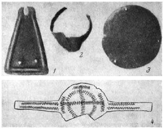 1, 3 — бронзовые бляшки; 2, 4 — бронзовый перстень и развернутая прорисовка его орнаментации.