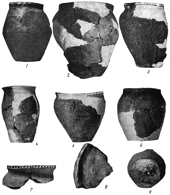 На полу жилища поверх черного натоптанного слоя лежала костяная проколка. В южной части печи между камнями развала найдены пружинные (овечьи) ножницы (рис. 10, 18). В стенках печи между камнями было много обломков керамики, из которых частично восстановлены два сосуда. Один из них — довольно значительных размеров горшок, сделанный на медленно вращающемся гончарном круге из глины с большой примесью крупного песка. Сосуд имел гладкий отогнутый наружу венчик, покатые плечики и округлые бока. Второй сосуд — лепной, конусообразно расширяющийся кверху, с едва обозначенным венчиком. Следует также отметить наличие тут обломков такого же типа гончарного сосуда с орнаментом из широких линий и кружков. В заполнении почти никаких культурных остатков не было.