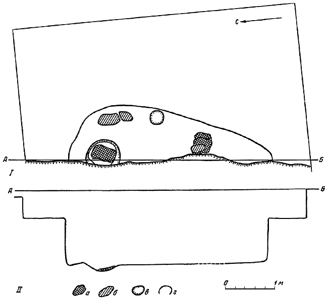 В южной части поселения на протяжении 250 м обнаружен культурный слой иного облика, характеризующийся своеобразной гончарной посудой. Здесь, на краю прежней второй надпойменной террасы, размываемой сейчас водами реки, раскопками 1953–1956 гг. были открыты остатки восьми жилищ, вытянутых в ряд вдоль берега (рис. 6) [432] . Расстояние между отдельными жилищами составляло 10–70 м. Другого рода построек выше по склону берега выявить не удалось. Разведывательные траншеи, заложенные в 1956 г. перпендикулярно линии берега, на некотором расстоянии от него, показали, что культурный слой далеко в глубь террасы не идет и отличается бедностью находок; в 30 м от берега он исчезает полностью. Все восемь открытых построек были одного типа — одинаково ориентированные полуземлянки, опущенные своей нижней частью в материковый лёсс.