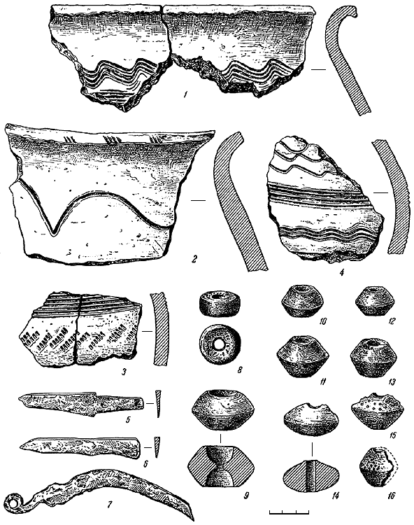 Материалы южной части поселения у балки Яцевой, Свистунова и Алексеевки, с одной стороны, имеют некоторые общие черты с материалами группы поселков, описанными в начале статьи, но, с другой стороны, значительно отличаются от последних.