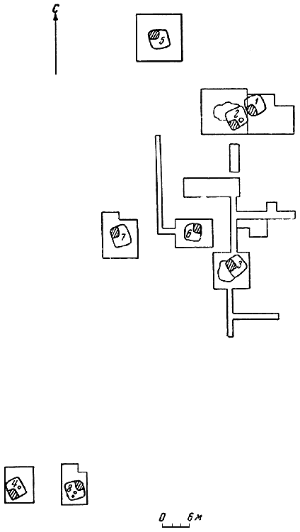 Нами была произведена тщательная разведка шурфами и траншеями разных частей урочища. На местах темных пятен, выявленных на материке, были разбиты раскопы (рис. 6) [478] .
