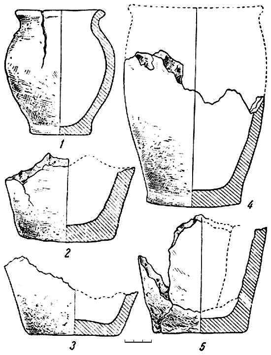 Обнаруженная в заполнении и на полу керамика принадлежит высоким горшкам с довольно широким горлом и большой выпуклостью стенок. Высоту по крупным фрагментам можно установить в 30–35 см, стенки достигают толщины 1,7–1,8 см, дно — от 2,0 до 2,5 см. Черепок как на поверхности, так и в изломе — черного цвета. Шейки у сосудов не выразительные, венчики незначительно отогнуты наружу, имеют прямой горизонтальный срез. Вся керамика без исключения лишена орнамента. В заполнении, кроме фрагментов лепной посуды, были встречены кости домашних животных, глиняная обмазка и уголь.