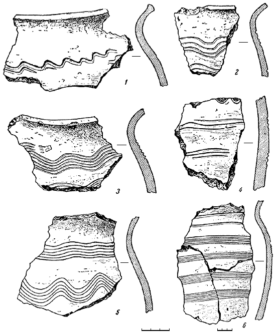 Керамика эпохи раннего железа представлена фрагментами от сосудов яйцевидной формы с выпуклым дном и узкой шейкой, по которой нанесен ямочный орнамент. Образцом такой керамики может служить целая посудинка с конически расширенным венчиком и узкой шейкой, на которой нанесен орнамент в виде ромбиков. Дно посудинки выпуклое, не отделено от стенок. Высота ее 10,8 см, диаметр венчика 11,0 см. (рис. 3, 7). Данная форма аналогична посуде, выявленной на поселении у с. Подгорцы Обуховского района Киевской обл. В.Н. Даниленко, который исследовал это поселение и датирует подобные памятники V–IV вв. до н. э. [475] Керамические материалы эпохи раннего железа из Луки-Райковецкой очень близки памятникам милоградской культуры в южной Белоруссии [476] .