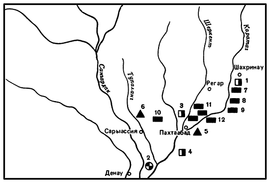 1 — Шахринауское городище; 2 — Халчаян; 3 — Узбеконтепе; 4 — Бешкала; 5 — Курганча; 6 — Караултепе; 7 — Кампыр-Зухро; 8 — Безымянное тепе (95); 9 — Аккурган; 10 — Караултепе; 11 — группа тепе у с. Курган-Куса; 12 — тепе в с. Минг-Тут.