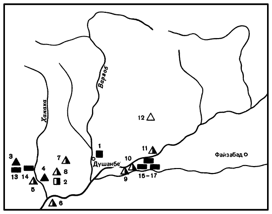1 — городище в г. Душанбе; 2 — Хоки-Сафед; 3 — Ката-Джелаил; 4 — Хисор; 5 — Тепеи-Гозийон; 6 — Кунябай; 7 — Кампыркала; 8 — Безымянное (23 км от Душанбе); 9, 10 — два безымянных поселения к северу от р. Илак; 11 — Калаи-Шодмон; 12 — Семигандж; 13, 14 — Нагоратепе. Безымянное тепе у с. Ноуабад; 15–17 — группа тепе к северу от р. Илак.