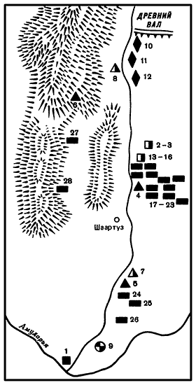 1 — Айвадж; 2, 3 — Калаи-Мир и Кей-Кобад-Шах; 4 — Доккы-Юнус; 5 — Безымянное поселение (к югу от с. Янгиюль); 6 — Хан-Газа; 7 — Безымянное поселение у с. Янгиюль; 8 — Мунчактепе; 9 — оазис у с. Шах; 10, 11 — крепости; 13–16 — Лянгарата, безымянное тепе, Сангова и Тоштепе; 17–23 — Ок-Мазар и шесть безымянных тепе; 24–25 — два тепе; 26 — Чимгалыштепе; 27 — Безымянное тепе; 28 — Актепе.