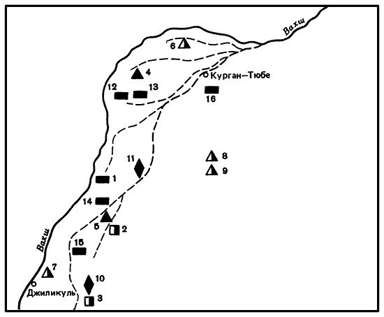1 — Саксанохур; 2 — Шуртепе; 3 — Шахртепе; 4 — Чоргультепе; 5 — Калаи-Турткуль; 6 — Пупганг; 7 — Теней Киевшайди; 8 — Игрониболо; 9 — Кокульское.