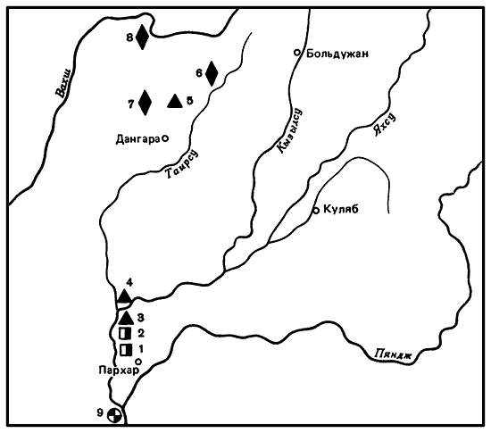1 — городище в Китабе (Каляндартепе); 2 — Кургантепа; 3 — Кенделиктепе; 4 — Джангальтепа; 5 — Аултепа; 6 — Шортепа; 7 — Калаи-Захоки-Марон; 8 — Пирмет-бабатепа; 9 — Коштепа; 10 — Шумлюктепе; 11 — Еркурган; 12 — Касантепа; 13 — Каджартепа; 14 — Касбитепа; 15 — Куня Фазли.