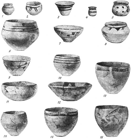 Рис. 1. Керамика Карадепе (1–5, 7–9), Ялангачдепе (6, 10) и Дашлыджидепе (11–16).