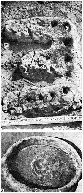 Рис. 8. Налеп в культовом здании Ялангачдепе (1) и круглый очаг-жертвенник на Айнадепе (2).