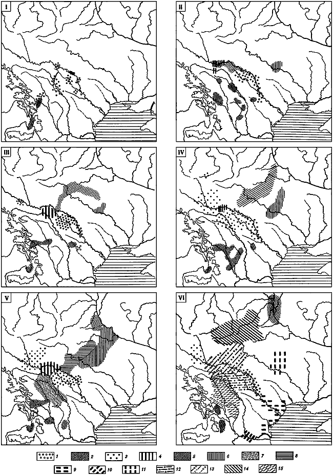 Попытка выявить наиболее древние памятники среднего периода культуры Триполье-Кукутени, непосредственно продолжающие развитие раннетрипольских и докукутенских, пока не привела к положительному результату. Вопрос о формировании памятников среднего периода рассматривается обычно на материалах поселений Юго-Восточной Трансильвании и Молдавского Прикарпатья (карта 5; 4, III, 2). Долгое время считалось, что отличительным признаком поселений 1-й ступени (Кукутени A1) является наличие бихромной, расписанной белой краской по серому или коричневому лощеному фону керамики (Vulpe R., 1957). Позднее выяснилось, что она постоянно встречается в сочетании с полихромной, расписанной в три краски посудой (Marinescu-Bilcu S., 1968, р. 413; 1977, р. 127), характерной для поселений следующей ступени (Кукутени А2). Правомочность выделения фазы Кукутени A1 на имеющихся материалах оказалась под сомнением, что заставило В. Думитреску ввести новый термин — Кукутени A1– А2 для обозначения начальной ступени среднего периода (Dumitrescu V., 1974 с). К этой ступени на территории Поднестровья и Побужья, по мнению Е.В. Цвек (Цвек Е.В., 1980б), относится часть поселений борисовского типа. Однако согласиться с таким заключением трудно, так как датирующая эти поселения керамика настолько развита, что может быть сопоставлена только с посудой, типичной для 2-й и 3-й ступеней среднего периода. Особенно показательны в этом отношении биноклевидные сосуды хорошо развитой формы (Черныш Е.К., 1975а). В настоящее время, видимо, только днестровские поселения типа Городница-Городище можно отнести к концу 1-й ступени среднего периода.