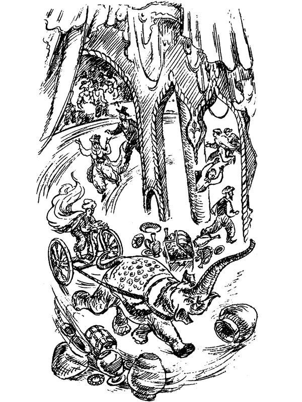 Гонория, в первую минуту приписавшая странные эволюции сцены количеству потребленного джина, теперь в испуге бросилась бежать навстречу вращению. Притихшая, завороженная публика могла насладиться созерцанием трех стремительно чередующихся декораций, среди которых Рози и Гонория ошалело бежали в противоположных направлениях. Адриан ухитрился выбраться из колонны и кинулся догонять Рози. Сцена, оправдывая старания своего творца, развила скорость около пятидесяти километров в час, так что отдельные части реквизита и декораций срывались с досок. Одного оркестранта ушибло пальмой, фрагменты дворца крушили базарные прилавки. Погоня Адриана за слонихой затруднялась тем, что он то и дело сталкивался с бегущей навстречу ему Гонорией, и, пока они вновь поднимались на ноги, Рози успевала увеличить отрыв.