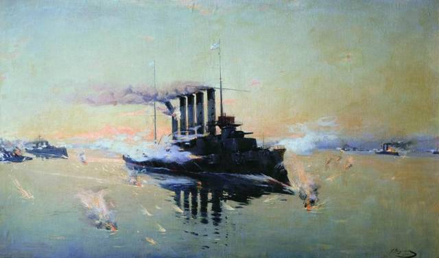 Русские бронепалубные крейсера «Аскольд» и «Новик» в бою с вражеским отрядом, миноносцы участвуют не менее активно в этом столкновении…