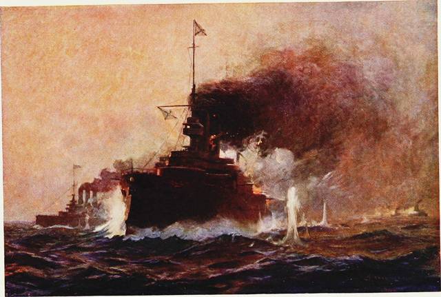 Русские броненосцы в бою с Объединенным Флотом. Впереди флагманский броненосец «Цесаревич», на втором плане «Ретвизан». Справа корабли из отряда Хейхатиро Того…