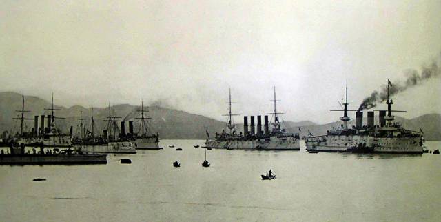 Русская Тихоокеанская эскадра в Порт-Артуре — в центре крейсер «Варяг» с характерными «американскими» трубами.
