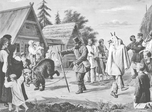 Медведь стал на четвереньки, жалобно замычал и поспешно побежал под ноги своему хозяину, а коза то опускалась на передние ноги, то вновь поднимала их и опять вертелась. Показал медведь, как девки горох воруют и как баба в кабак идет похваляется и, из кабака выйдя, по земле валяется.