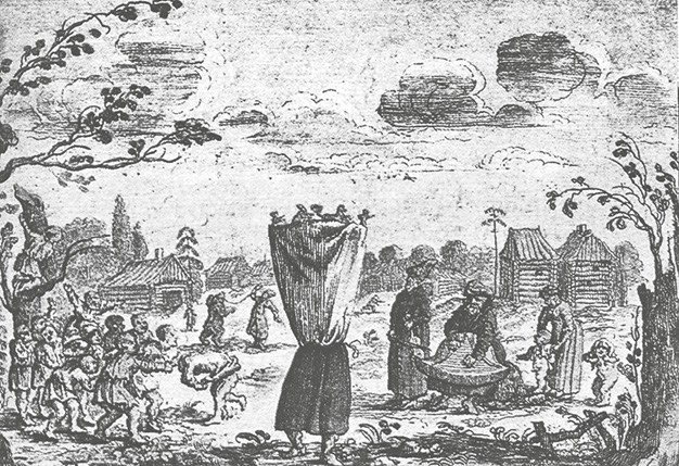 После плясунов выступил мужичонка с куклами. Он надел на себя нечто вроде кринолина, потом вздернул его выше головы и образовал таким образом некоторое подобие ширмы, из-за которой стал показывать кукол, говоря за них прибаутками (некоторое подобие современного Петрушки).