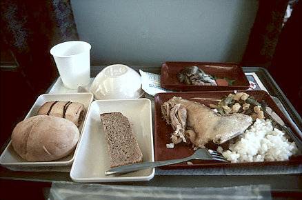 Не успели второй раз взлететь — понесли обед. На белых пластмассовых подносиках были расставлены те же круглые пиалушки с разлитым чаем и прямоугольные тарелки (снова коричнево-«бакелитовые» или, для разнообразия, такие же, но белые). Кушать полагалось обычными стальными столовыми приборами, прям как через двадцать лет в бизнес-классе.