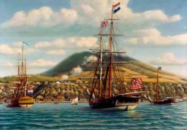 Бриг Континентального флота США «Андреа Дориа» приветствуют салютом в голландской колонии Синт-Эстатиус. Морская галерея искусства, округ Вашингтон. Фото картины сделано полковником Филиппом Мелвиллом в 1977 г.