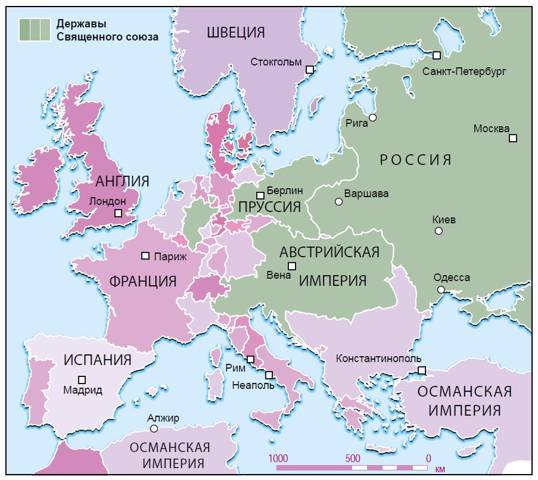 Страны Европы в 1815–1847 гг. Страны, выделенные зеленым цветом, составляют Священный союз (Россия, Австрия, Пруссия).