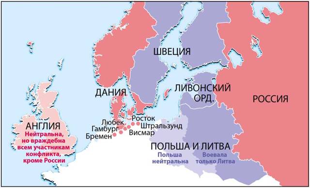 Что касается Ганзы, то изначально Любек соблюдал нейтралитет, но после захвата Ревеля (который до этого входил в Ганзейскую лигу) решил в 1562 году поддержать Данию в войне против Швеции (улыбка судьбы, ведь Швецию 40 годами ранее Любек создал своими собственными руками), не мешаясь в ливонские дела. Окончательно договор Любека и Дании был оформлен в 1563 году. Согласно его положениям, Любек выделял Копенгагену 140 тысяч талеров, в обмен на которые датский король обязывался начать войну со Швецией. Но Дания была обязана в ходе войны возместить эти расходы Ганзе с захватов на шведских землях.