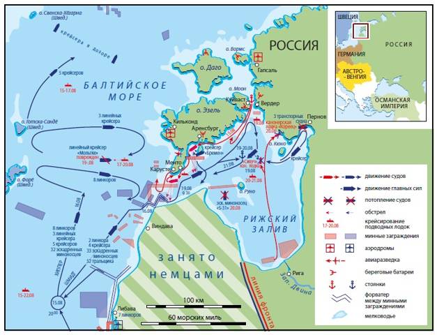 21 августа 1917 года немецкая армия вошла в Ригу. 29 сентября началась Моонзундская операция (у немцев она традиционно называется операция «Альбион»). Командование Германии выделило для проведения операции пять дредноутов, пять эскадренных броненосцев, один линейный крейсер, девять легких крейсеров, одна минзага плюс мелкие суда, а также 102 самолета и 25-тысячный десант. Русские силы обороны Рижского залива насчитывали два броненосца, два броненосных крейсера, один крейсер, три минных заградителя, 26 эсминцев, семь миноносцев и три подводные лодки. Острова Эзель и Даго защищали 7–8 тысяч человек, при этом дисциплина в них была отвратная. Кроме того, русские опирались на мощные береговые батареи, которые, однако, могли стрелять только в направлении моря.
