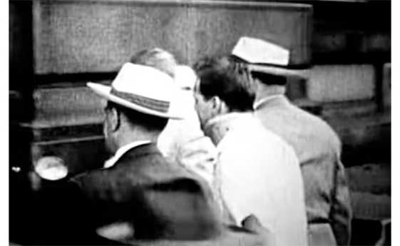 Сэм Шеппард плечом к плечу с адвокатом проходит в здание суда для участия в работе коронерского жюри (кадр записи, сделанной любительской кинокамерой 22 июля 1954 года).