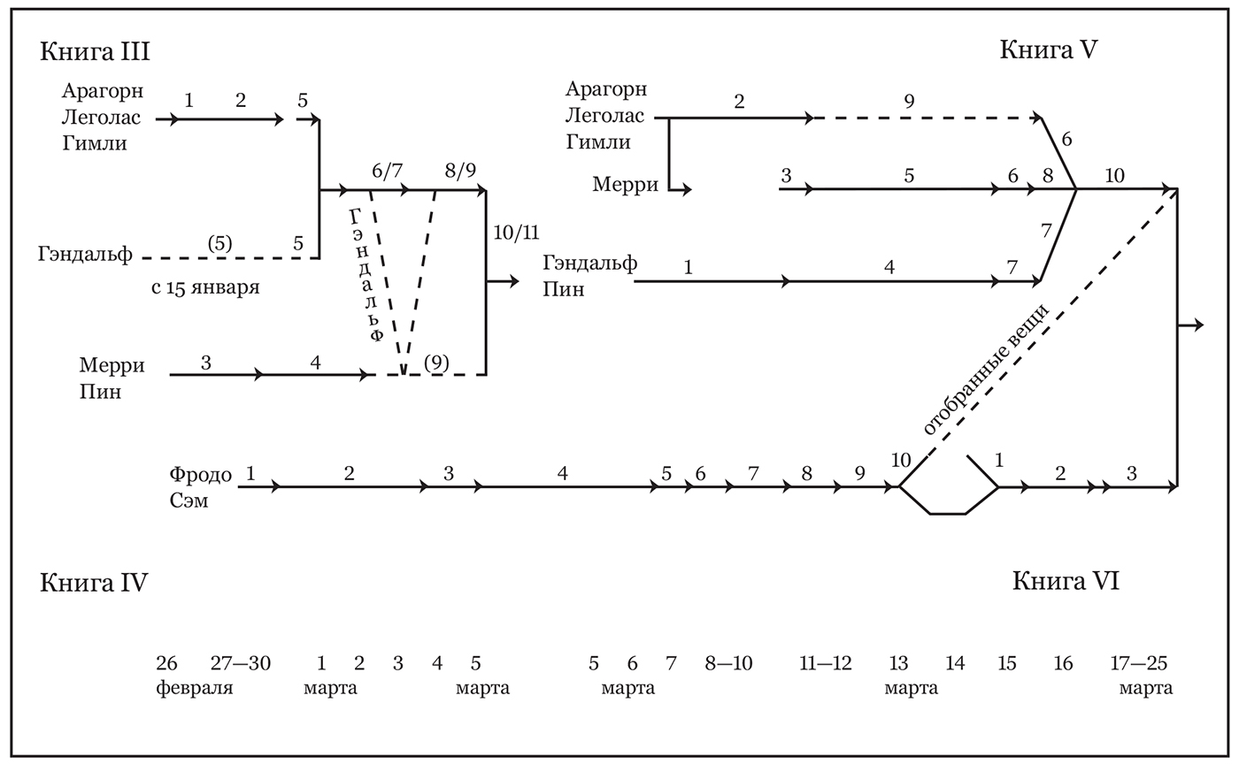 Это становится очевидным из структуры повествования с начала «Двух твердынь» и до главы 4 «На Кормалленском поле» книги VI в томе «Возвращение короля». Я попытался изобразить это в виде схемы, которую, правда, пришлось несколько упростить. Так, на ней не изображено непродолжительное расставание Леголаса и Гимли в главе 7 книги IV; для полного описания перемещений всех персонажей 15 марта потребовалась бы отдельная схема; и, разумеется, на ней присутствуют лишь Хранители, но не фигурируют другие герои трилогии. В то же время схема может служить иллюстрацией того, как выглядели различные сюжетные линии этих частей и как они «переплетались» между собой.