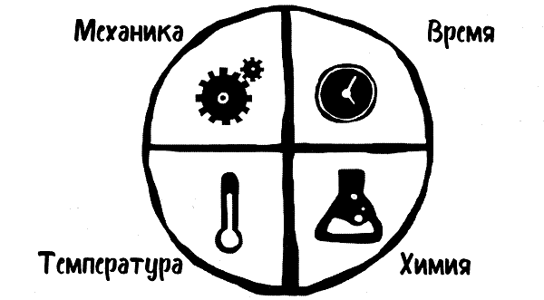 Рис. 5. Круг Зиннера — эффективность процесса очистки определяется четырьмя факторами. Если один из них уменьшается, он должен быть компенсирован остальными. Например, если сокращается время, должна быть усилена механика, повышена температура или использовано больше химических средств