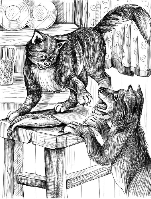 Вот раз кормил я моих зверей, и Манефа, сидя на табурете, доедала рыбёшку. Волчонок кончил своё и полез к кошке. Он стал лапками на табурет и потянулся мордой к рыбе. Я не успел крикнуть «тубо», как Манефа зашипела, хвост веником и – раз! раз! – надавала волку по морде. Он завизжал, присел и вдруг бросился настоящим зверем на кошку. Всё это было в одну секунду: волк опрокинул табурет, но кошка подпрыгнула на всех четырёх лапах и успела рвануть его когтями по носу, – я боялся, чтоб не выцарапала глаза. Я крикнул «тубо» и бросился к волку. Но он уж сам бежал ко мне, а кошка наскакивала сзади и старалась процарапать сквозь шерсть. Я стал гладить и успокаивать волчонка. Глаза были целы, – оказался порядочный шрам на носу. Шла кровь, и волчонок зализывал языком больное место. Плишка во время боя скрылась. Я с трудом вызвал её из-под кровати. Там была лужа.
