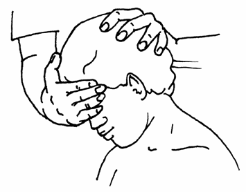 Движения туловищем также выполняются в положении сидя. Массажист встает позади пациента, кладет руки ему на плечи и выполняет наклон вперед, затем выпрямляет и немного разгибает туловище назад (рис. 42). Для выполнения поворотов массажист фиксирует руки на области дельтовидных мышц и разворачивает туловище в стороны.