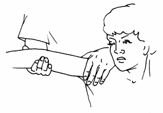 Движения в плечевом суставе проводятся в разные стороны. Пациент сидит на стуле, массажист стоит позади, располагает одну руку на плече, а другой фиксирует предплечье возле локтя и выполняет движения вверх и вниз, затем располагает руку пациента горизонтально и поворачивает ее внутрь и наружу, после этого производит вращательные движения (рис. 43).