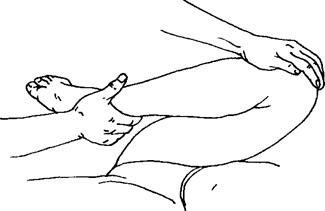 При проведении сгибания в положении лежа на спине массажист одной рукой фиксирует голеностопный сустав, другую располагает на колене пациента и плавно выполняет движения (рис. 47).