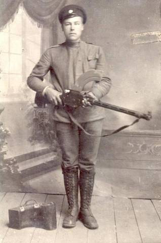 Русский стрелок с ручным пулеметом «мадсен» (сошки сняты).