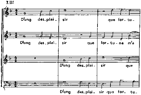 Нами уже неоднократно указывалась близость творчеству Жоскена (своей образной сферой, техникой выполнения) сочинений его современника — Пьера де Ла Рю. И песни не являются в этом отношении исключением, они — типичнейший пример французской chanson, что подтверждается содержанием их текста, общей формой, интонационным строением. Вот перевод текста и начальные такты одной из chansons Пьера де Ла Рю — «D'ung desplaisir que fortune m’a faicht»: