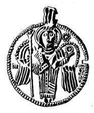 Найденный на усадьбе О. Гречина амулет - характерный признак сохранявшегося двоеверия: с лицевой стороны изображение архангела Михаила, с оборотной (на всякий случай) - голова Медузы с двенадцатью змеевидными отростками.