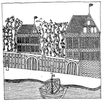 53. Пригород. Застройка набережной. 1578 - 1686 годы. Фрагмент так называемого Ростокского свитка, созданного Вике Шорлером