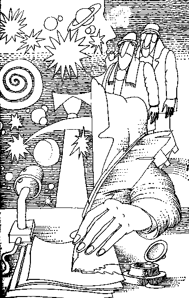 Когда корректор Крект пришел в ночной бар «Звездочка», встреча с пришельцами была в разгаре. Гости сидели за столом, но не так, как сидят в барах, а так, как сидят на собраниях: графин с водой да ваза цветов — вот и вся скромная сервировка.