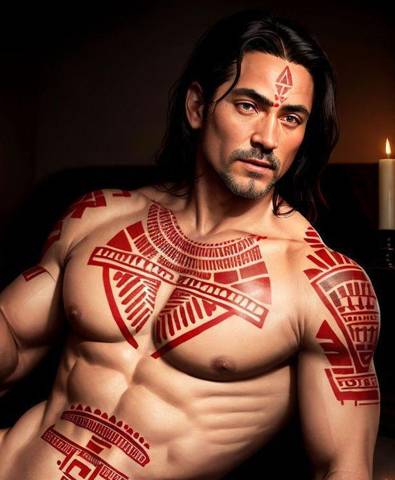 Его торс покрывали какие-то притирания, делавшие кожу блестящей и более темной, отчего знаки, нарисованные на его груди и животе казались рельефными и будто живыми.