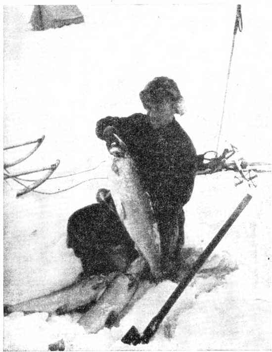 Хорошо, когда есть ледовые холодильники! (И. Д. Папанин достает из ледника замороженную рыбу.)